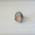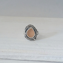Very unique ring that has a beautiful piece of pink seaglass wrapped in a original designed setting. This pink seaglass ring is made of sterling and fine silver and finished with a dark patina