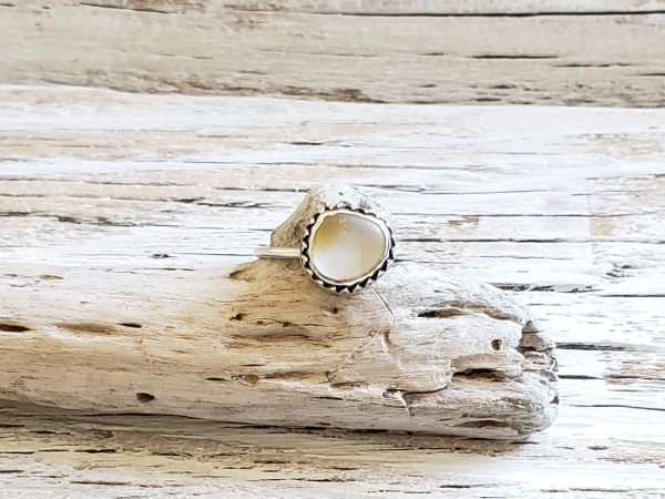 This is a pretty unusual piece of seaglass, it is clear with a tiny little yellow spot in the corner. I have tried to capture it in these pictures. I love the look of this seaglass ring set with a decorative bezed and lightly darkend to show off the seaglass.